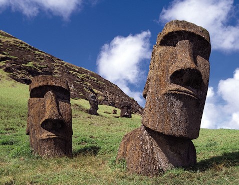 Roggeveen came upon an astonishingly unique culture tragically dying.  A thousand years before (ca. 700 AD), the island was reached by Polynesians in their canoes from Gambier (aka Mangareva – see triangle map).  A Stone Age people with no metal implements had carved huge stone statues called moai out of volcanic tufa with basalt chisels, dragged them over to the island’s edges, and erected them standing in the hundreds.   Almost 900 moai dot the island today.