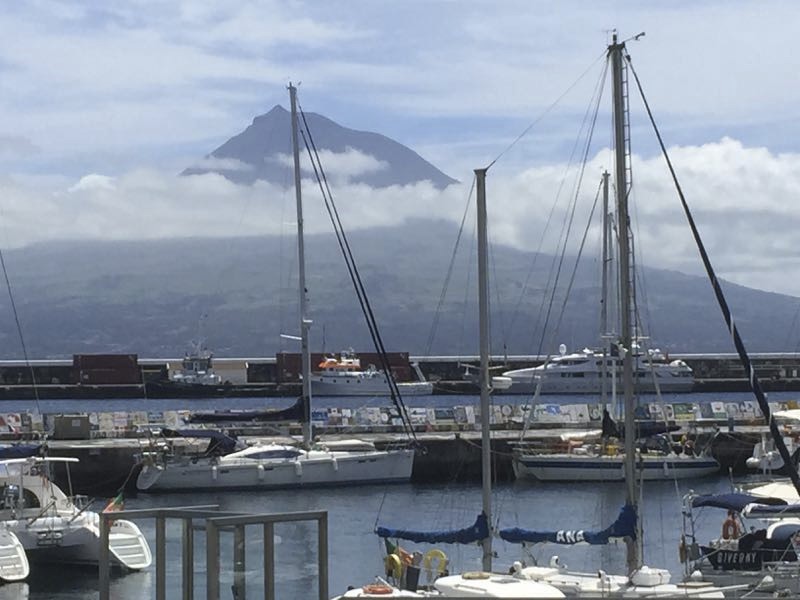 The place to stay is Horta’s best, the Hotel do Canal overlooking the waterfront.  During our stroll along the marina, we can’t help noticing the huge volcano of Pico looming above on the nearby Pico island – and all the sailboats and yachts in the marina.
