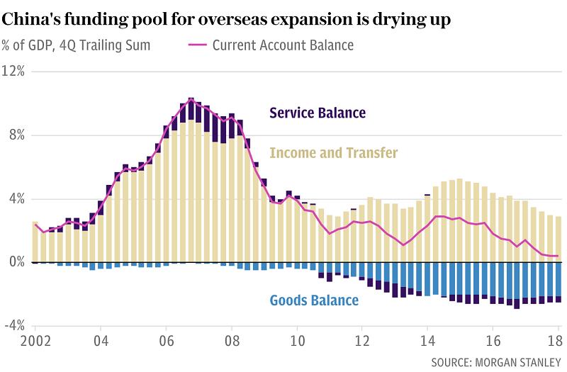 Today, China’s current account surplus has essentially vanished. The International Monetary Fund thinks it will be 0.5% of GDP this year. It will then go progressively negative through the early 2020s.