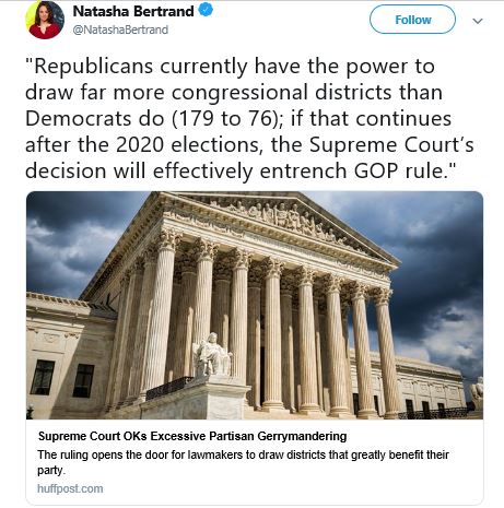 “Republicans currently have the power to draw far more congressional districts than Democrats do,” wailed Natasha Bertrand, national security correspondent for Politico. “If that continues after the 2020 election, the Supreme Court’s decision will effectively entrench GOP rule.”