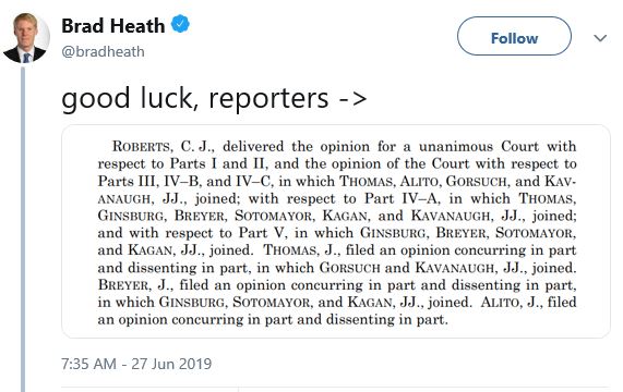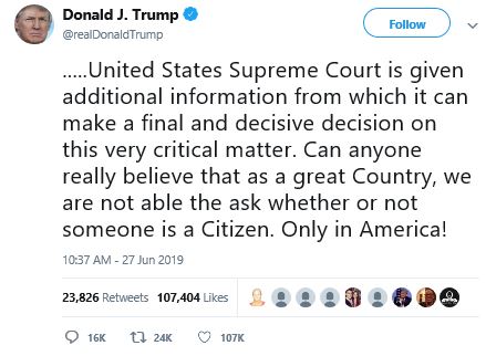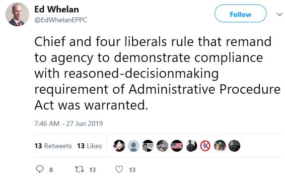 edwhelan_tweet-062719The Supremes overturned the ruling of a district court judge in New York that asking the citizenship question was “substantially invalid,” voted to send it back to him for a rehearing.