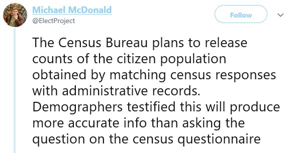 “The Census Bureau plans to release counts of the citizen population by matching responses with administrative records,” McDonald said. “Demographers testified this will produce more accurate info than asking the question on the census questionnaire.”