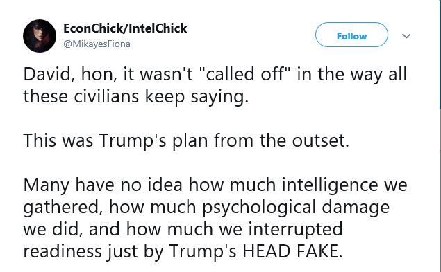 col-rob-maness-tweetThis was a PSYOP from the get-go, said former Air Force intelligence officer Fiona Mikayes, who also worked in the NMCC. The president never intended to launch a strike, she said. Maness agreed.