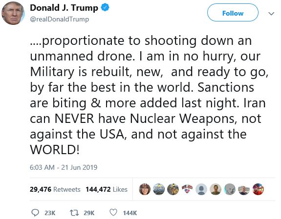 The most true part of Trump’s explanation for why he called off a retaliatory strike after Iran shot down a reconnaissance drone is when he said: “I’m in no hurry.”