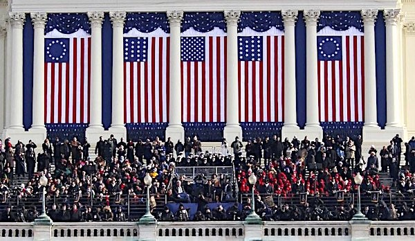 The Betsy Ross Flag has been a symbol of American patriotism since 1777, with thirteen stars of the thirteen founding United States.  Two (on either end) were on prominent display at Obama’s second inauguration.