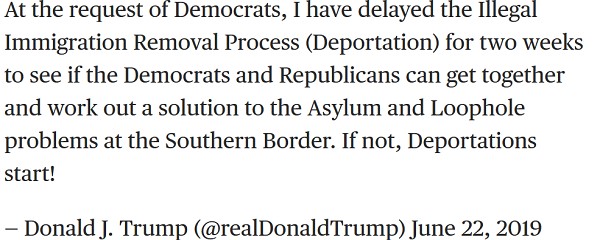 Those two weeks are up tomorrow.  And of course, the Dems have stonewalled any attempt at a solution.  Thus on Monday (7/01) at the White House, POTUS declared, A Lot of People Will Be Deported After July 4.