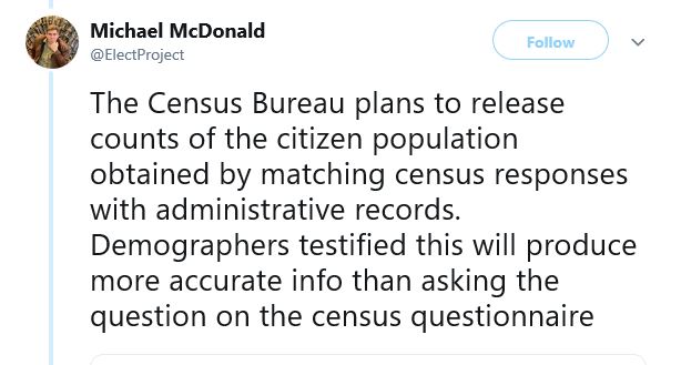 But there’s a more accurate, less expensive means of determining how many citizens and non-citizens there are the Census Bureau is planning to utilize whether or not a citizenship question is asked, said Michael McDonald of the Elections Project.