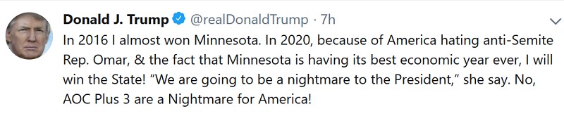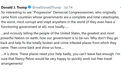 trump-tweet-071419I’m tired of hearing conservative friends apologize for President Trump’s “go back to where you came from” tweets about the likes of Ilhan Omar.