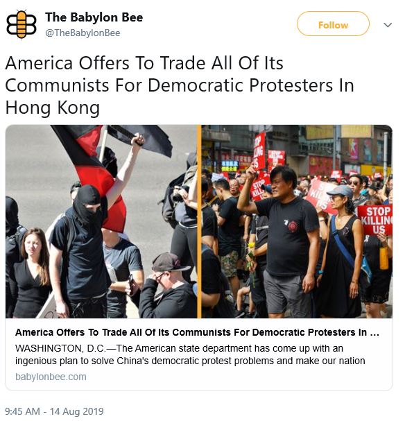 Those risking their lives to demonstrate for freedom in Hong Kong fly the American flag and sing (badly) the Star Spangled Banner.