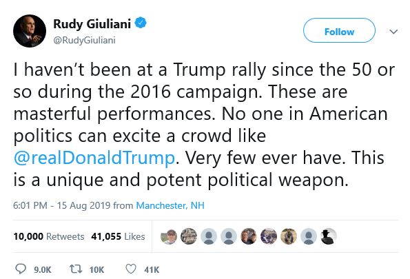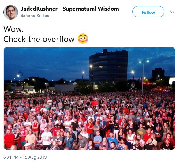 President Trump held a rally in Manchester, New Hampshire last night (8/15). As per usual, the stadium was filled. Here’s the overflow crowd:
