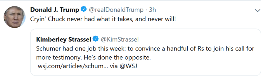 Kim Strassel’s Schumer Whiffs Impeachment in the Wall Street Journal this morning (1/24) exposes Schumer’s real game: becoming majority leader.