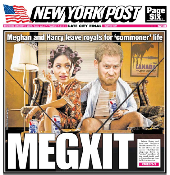 But let’s face it – the most hilariously inconsequential news of the week was Megxit.  Harry turns out to be so p-whipped he allows his brain turned into mush by a goldbricking American divorcee libtard.  What a pathetic dolt.  No wonder the Queen cut him loose – good for her.  The NY Post’s cover is a classic: