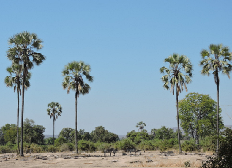 These mark the encampment of Arab slavers conducting slave raids.  They’d toss the pits of the dates they ate, some of which grew into palm trees.  They are not native to Africa.