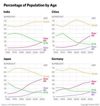 You know the critical question to ask about a country’s future:  Does a country have time to get rich before it gets old?  Japan did, India does, China doesn’t.  (We’ll talk about Germany at a later date.)
