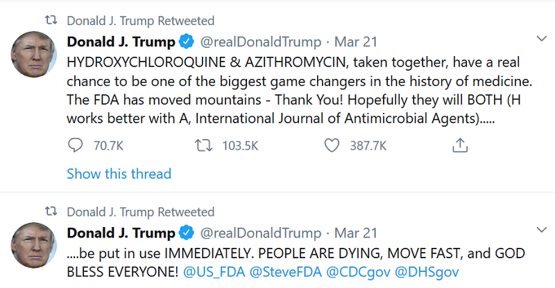 Within hours of Trump’s tweet, the New York Times huffed: Trump’s Embrace of Unproven Drugs to Treat Coronavirus Defies Science.