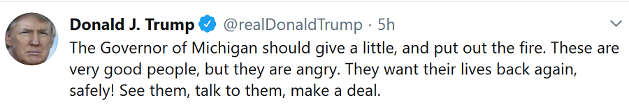 Maddest of all are Michiganders rapidly approaching armed revolt against Wretched Gretchen the Half-Wit.  She should use that half-brain of hers to take POTUS’ advice this morning (5/01):