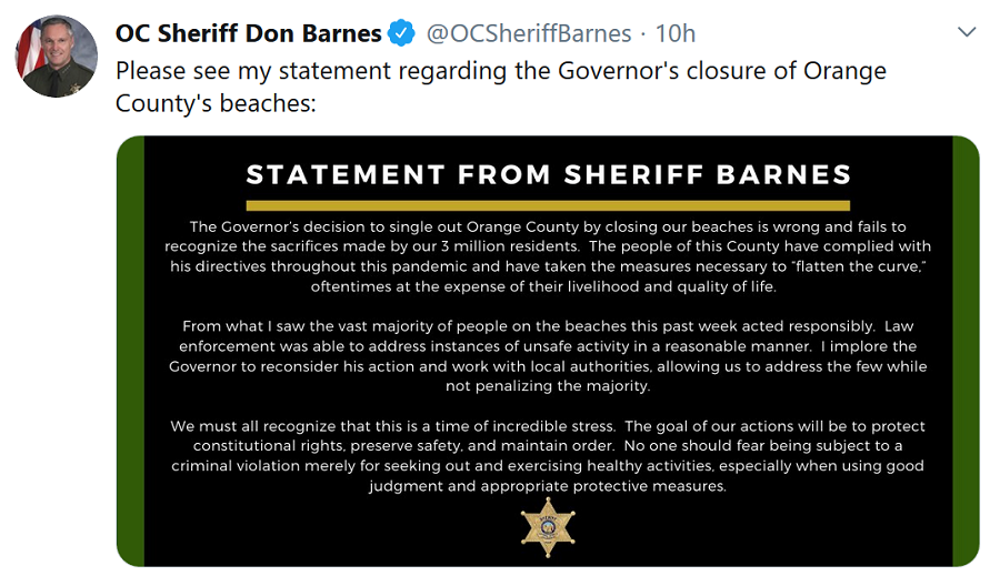 Immediately in response, Orange County Sheriff Don Barnes told the press The Orange County Sheriff’s Department Will Not Enforce Newsom’s Order: We are “not taking enforcement action on this order,” he said.  Early this morning (5/01), he issued this statement: