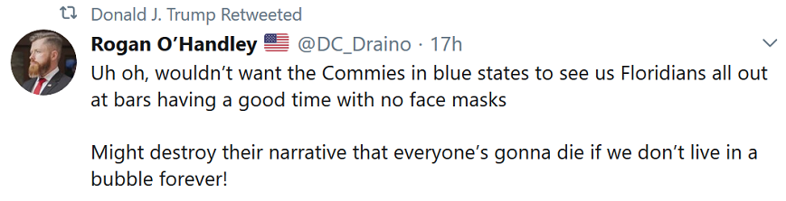 It’s interesting that there is some recognition of this within Enemedia ranks.  Look at this from the lefties at Politico last night (5/14): Florida Man Beats Covid, For Now.  The Florida Man is none other than Republican Governor Ron DeSantis.