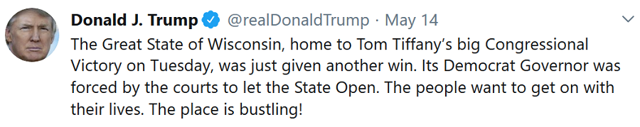Yesterday (5/14): Wisconsin Supreme Court strikes down state’s stay-at-home order.  It pained WaPo to report: Wisconsin bars packed with patrons almost immediately after court strikes down stay-at-home order.  POTUS celebrated: