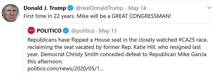 And in California on Tuesday (5/12), the special election in CD25 (mostly northern LA county) was a Democrat disaster, with Navy carrier fighter pilot Mike Garcia winning by over 55%.