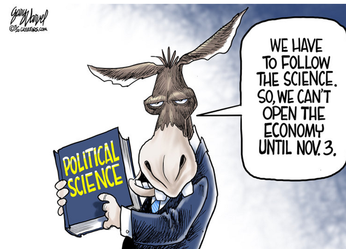 There’s a further lesson:  that Democrats want us to be fearful and stupid.  What better way to make people want to be controlled by them and their government edicts?  The trick is, how can they keep the fear and submission going all the way to November 3rd?