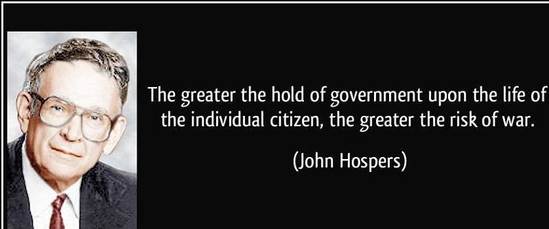 govt-control-leads-to-war[This is Part Two of my Festscrifft to the memory of Professor John Hospers (1918-2011), my mentor under whom I gained my doctorate in philosophy, and the first presidential candidate of the Libertarian Party in 1972.  Part One was in TTP last Monday (7/27).  The concluding Part Three will be next Monday (8/10).  It will appear entire as a chapter in the forthcoming book, “Libertarianism and the Libertarian Party at 50 and Beyond,” edited by Stan Oliver and C. Ron Kimberling.]