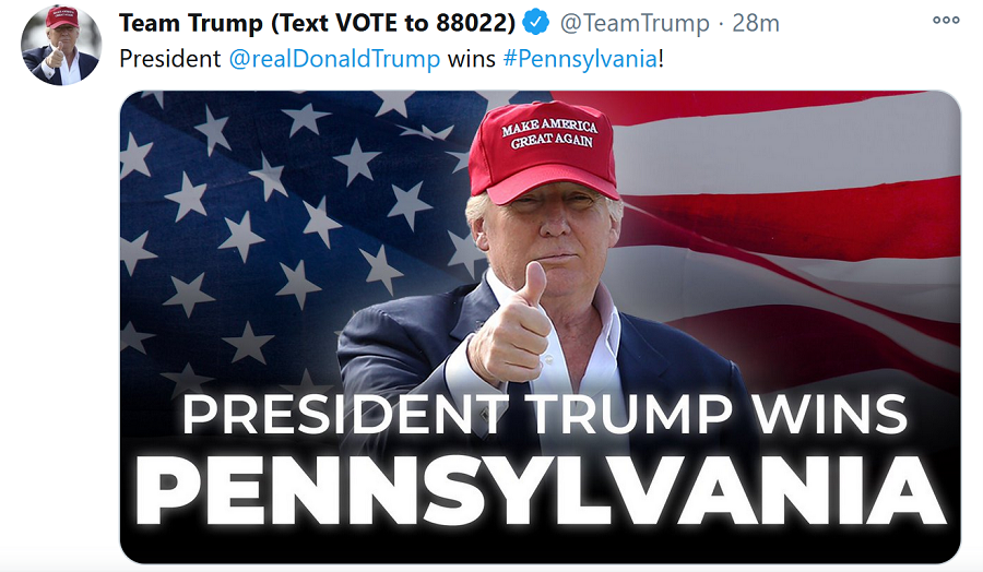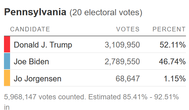 Yes, the Dems in charge of Pennsylvania and Wisconsin are doing their best to steal the election, Team Trump lawyers are suing, and it will end up in court.  But the steal is just too big to get away with in PA – so if POTUS carries Arizona he’s reelected.