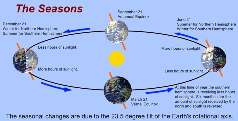 How is this possible? Because the Earth doesn’t go around the Sun facing straight ahead but at an angle – the Earth is tilted towards the sun, thanks to the gravitational pull of our Moon.  This is why we have seasons – days get longer and warmer in the summer, shorter and colder in the winter.