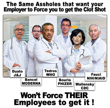 And another reminder, while you must be jabbed to work, their employees are exempt. As are members of the Supreme Court, Congress, their staffs, the postal workers, and these folks: