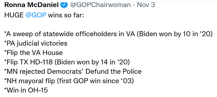 The best news of 11/02/21 is not all the pro-American victories but that the Dems and Woketard Left will learn nothing from them.  They will double down on their now dead horse narratives instead of being smart by dumping or moderating them. They will remain in bitter angry denial because denial of reality is at the core of how they perceive the world.