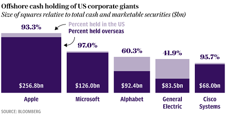 Apple has $257bn parked abroad beyond the reach of the Internal Revenue Service. Alphabet (Google) has $126bn, Microsoft $84bn, Cisco $68bn, and Oracle $59bn. The US Bureau of Economic Analysis estimates that total retained earnings outside the country have mushroomed to $4 trillion.