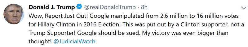 Trump's tweet likely referred to a 2017 white paper published by the American Institute for Behavioral Research and Technology (AIBRT) suggesting that Clinton's popular vote margin was almost entirely attributable to pro-Clinton bias at Google.