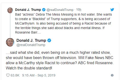 trump-tweet-on-debra-messingDid anyone believe Will & Grace stars Debra Messing and Eric McCormack when they backtracked on their demand Hollywood supporters of Donald Trump attending the president's coming Beverly Hills fundraiser be outed and consequently blacklisted from The Industry?