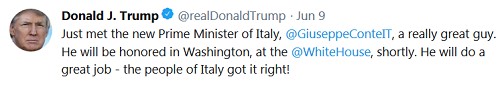trump-tweet-060918 And how about this for getting it right?  For the first time since the "humanitarian crisis" began five years ago, the Italian government has closed its ports to a migrant vessel: The MV Aquarius, operated by SOS Mediterranée and Médecins Sans Frontières, was refused permission to dock in Sicily, and told to push off and find somewhere else.