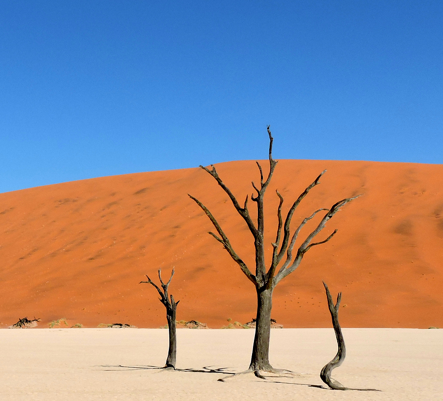 dead-vleiMany consider this the most surrealistic place on earth. The clarity of the air turns the sky deep cobalt blue, the dunes are so old they’ve rusted red, combining with the white clay floor to give the skeletal trees a scene out of a Dali painting or a science fiction movie. But it’s real.