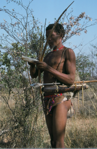 We were a bizarre lot, the handful of us who camped out nearby – though not too nearby to be intrusive. In turn, their lives were equally strange to us (well, maybe not to Jack – this was his third “first contact”). They wore gazelle-hide loincloths and no shoes, and lived on a very sparse fare of roots, wild melons and whatever game they could snare or hunt. They had huts built out of small branches, but they usually slept outside of them, circled close to the fire.