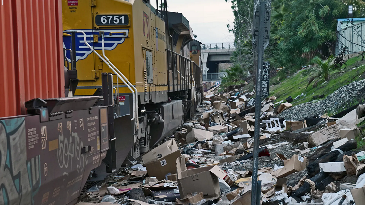 This is packaging debris and items stolen from rail cars littering train tracks near the Union Pacific Lincoln Heights rail yard in Los Angeles last Sunday (1/15). It was the lead photo in the Fox Primetime interview by Pete Hegseth of Victor Davis Hanson yesterday evening (1/18).