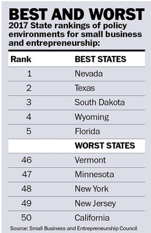 What is troublesome is that year after year the business-unfriendly states do so little to improve their rankings. As the author of the study, Raymond J. Keating, chief economist of the SBE Council, noted: “Too many elected officials choose to ignore the basic economic realities of how government affects entrepreneurship, business, and investment.”