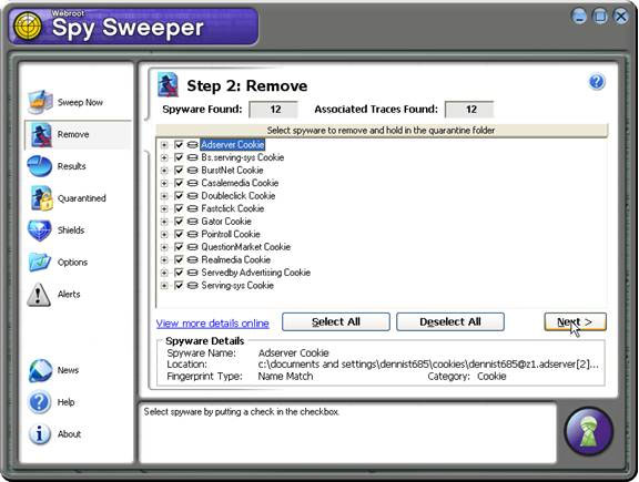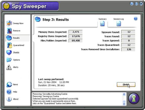 After all the nasty sites I went to I guessed there’d be some intruders on my system. My nightly SpySweeper scan proved my suspicions to be true.