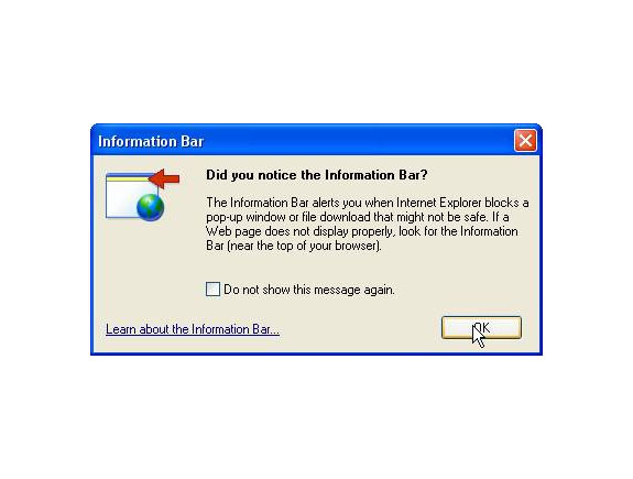 If that’s not enough to scare you into closing the window immediately, Service Pack 2 comes to the rescue. If you click ‘open’ or ‘download’, Internet Explorer won’t respond. You must click the information bar first!