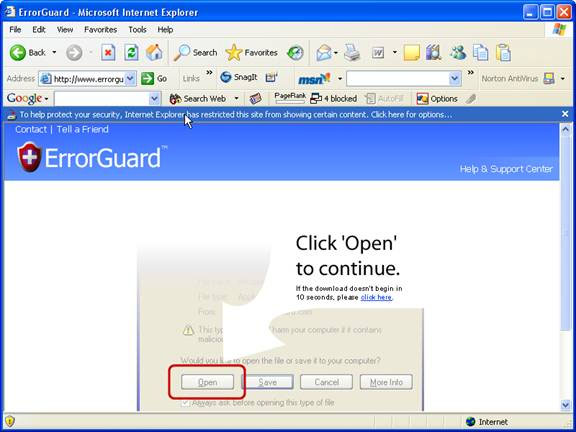 The information bar is on top, where the cursor appears. An experienced user should be suspicious anyway. The bold headline “Click ‘Open’ to continue.” And the sentence below, “to download, click here.” There’s a red rounded rectangle around the open button. But there’s no information about what ErrorGuard does.