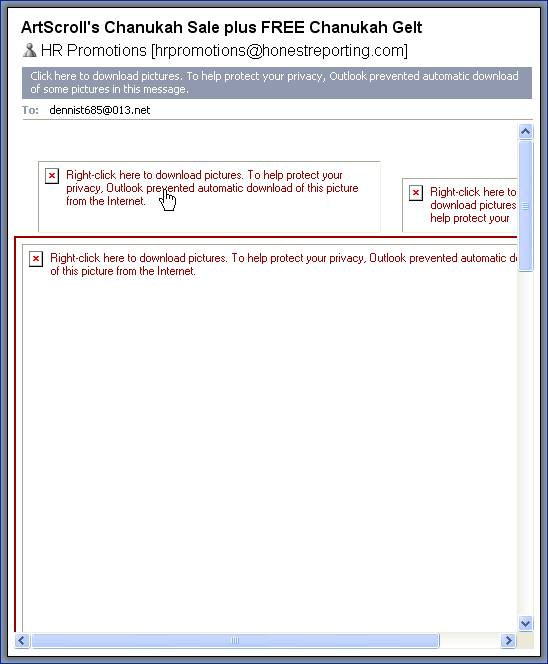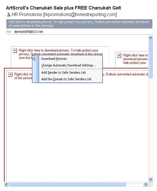 For example, what a lot of folks don’t know is that many graphics in emails, if clicked, either install malware on your computer or take you to web pages that do the same. Therefore, if Office Update’s added protection for Microsoft Outlook is suspicious of the sender, it does the following: