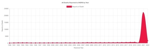 Within a couple of months, death reports garnered by the Covid injections exceeded the annual record count of any other vaccine in the database’s history. In less than twelve months, the number of deaths related to the Covid injections exceeded the death total recorded in connection with all the other vaccines in the last thirty years.