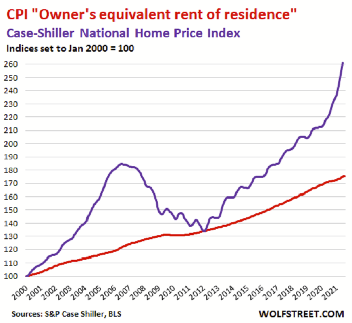 Or take the “owner-equivalent” scam to “calculate” housing costs which make up over 25% of the CPI. It consists of BLS calling up less than a thousand homeowners around the country and asking them: “If someone were to rent your home today, how much do you think it would rent for monthly, unfurnished and without utilities?” No real data, just a collection of homeowner opinions. And wildly out of reality, which is Case-Schiller determining a 19% surge in home prices in the last 12 months.