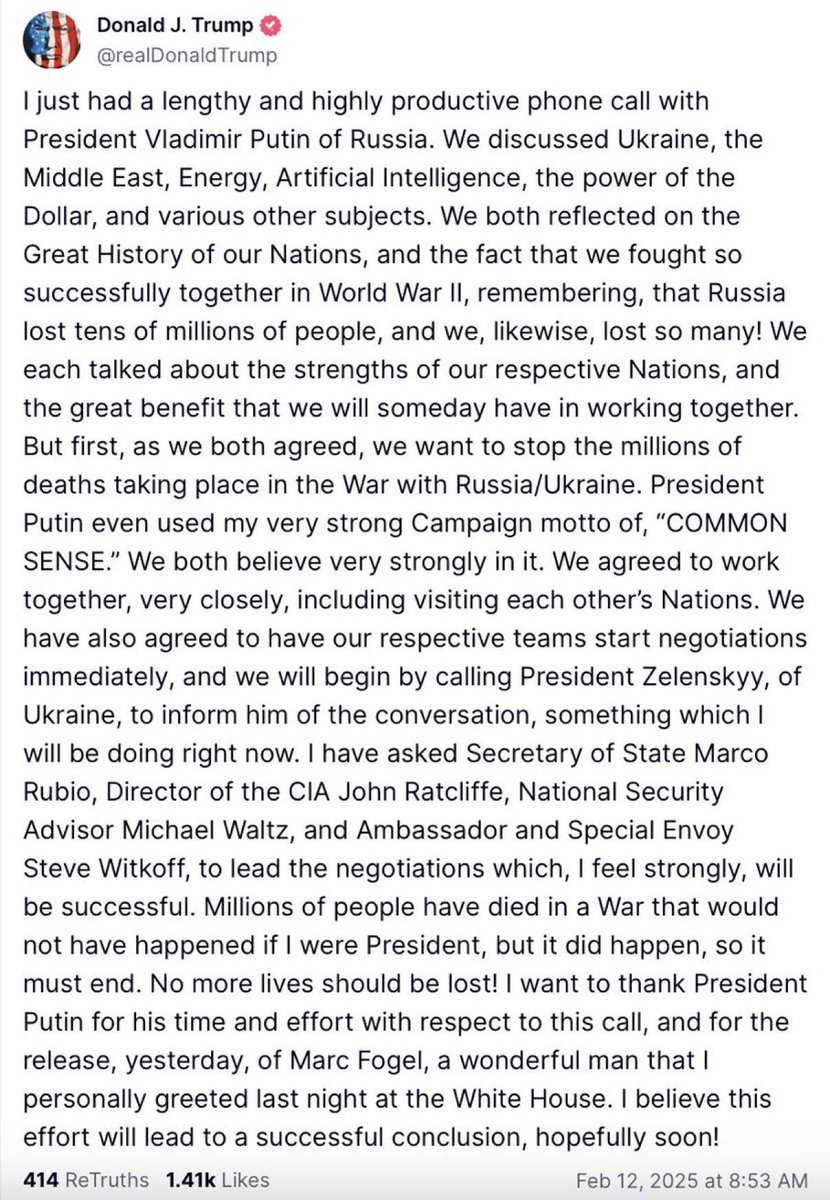 But all that laughter stopped after Vice-President Vance gave an interview to the Wall Street Journal yesterday (2/13): Vance Wields Threat of Sanctions, Military Action to Push Putin Into Ukraine Deal.