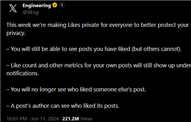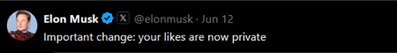This is important. Remember the role played by Twitter in woke cancellation of anyone unwoke. Musk bought it in part to put an end to this. Making Likes private makes it much harder for someone to be cancelled. No one knows what you Liked, only you do, so woketards can’t accuse you of Liking, say, anti-tranny memes.