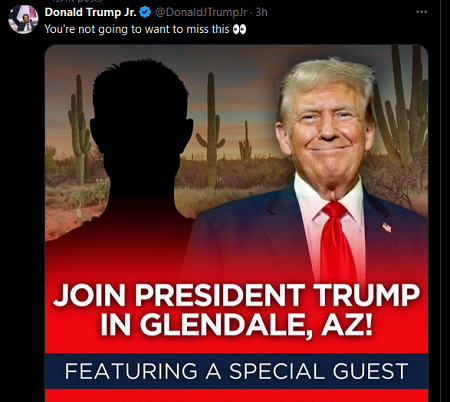This evening in Glendale, Arizona, PDJT will be holding a mega-MAGA rally. Here’s what Donald Trump, Jr. posted earlier today: