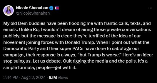 Yes, Nicole is RFK, Jr.’s running mate, formerly married to Google co-founder Sergey Brin, having as a result a net worth of over $1 Billion. Last night (8/22) she posted this: