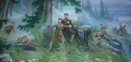 You see this painting all over North Korea, portraying Nork founder Kim Il Sung (1912-1994) and his wife winning World War II by fighting Japanese soldiers in the Paekdu Mountains. All any North Korean knows about WWII is Kim’s myth, certainly not the truth that Kim and his wife spent the entire war in Khabarovsk, Soviet Siberia.
