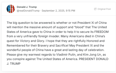 The official Chicom government excuse was to celebrate “the 80th anniversary of victory over Japan and the end of World War II.” But that’s a joke. The day before, September 2, 1945, Japan unconditionally surrendered to America on the deck of the USS Missouri in Tokyo Bay, formally ending the war.